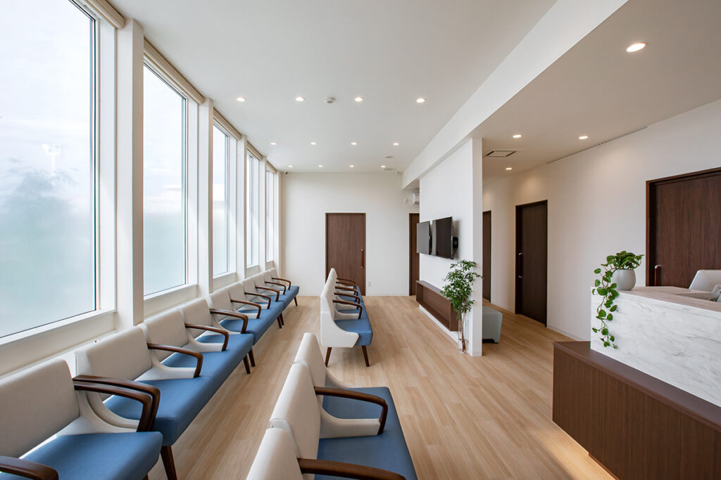 患者様が過ごす待合スペースは、南面の窓からたっぷりと光が差し込む、明るく心地よい空間です。窓上の庇は夏の強い日差しを遮るとともに、建物のデザインのアクセントにもなっています。