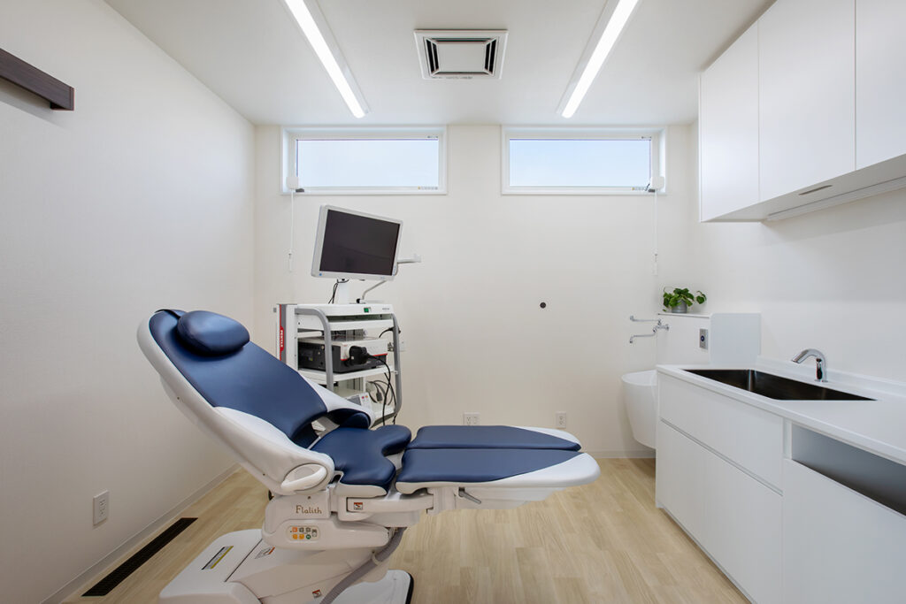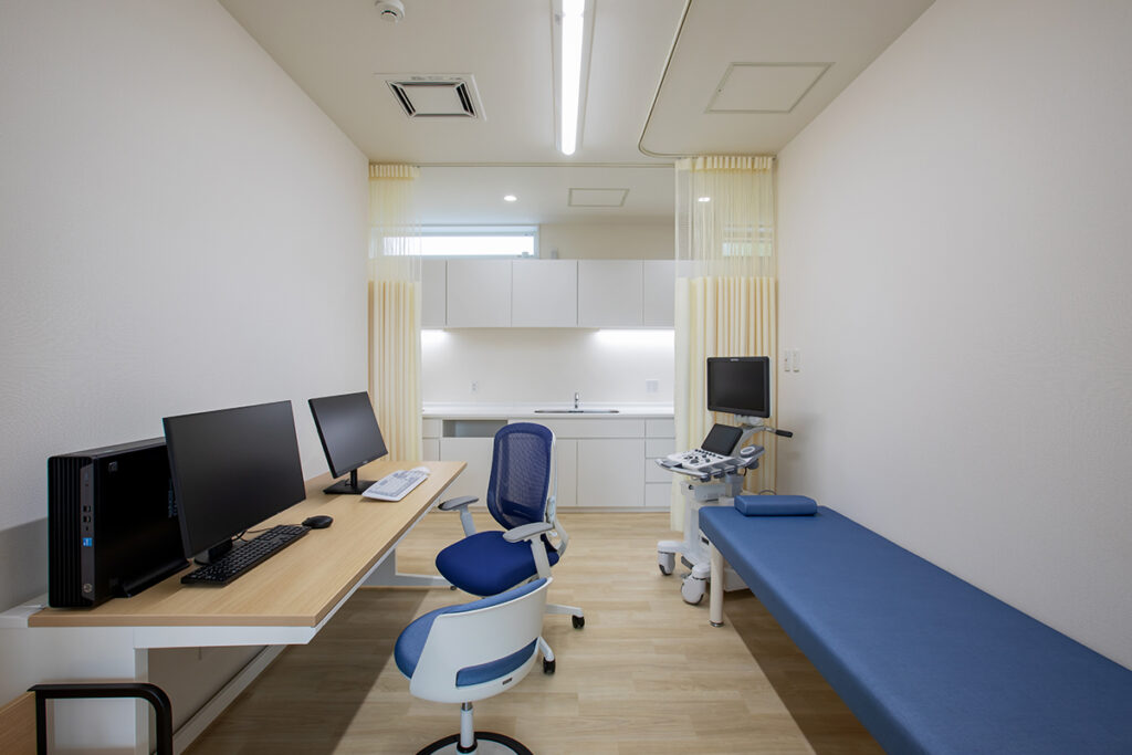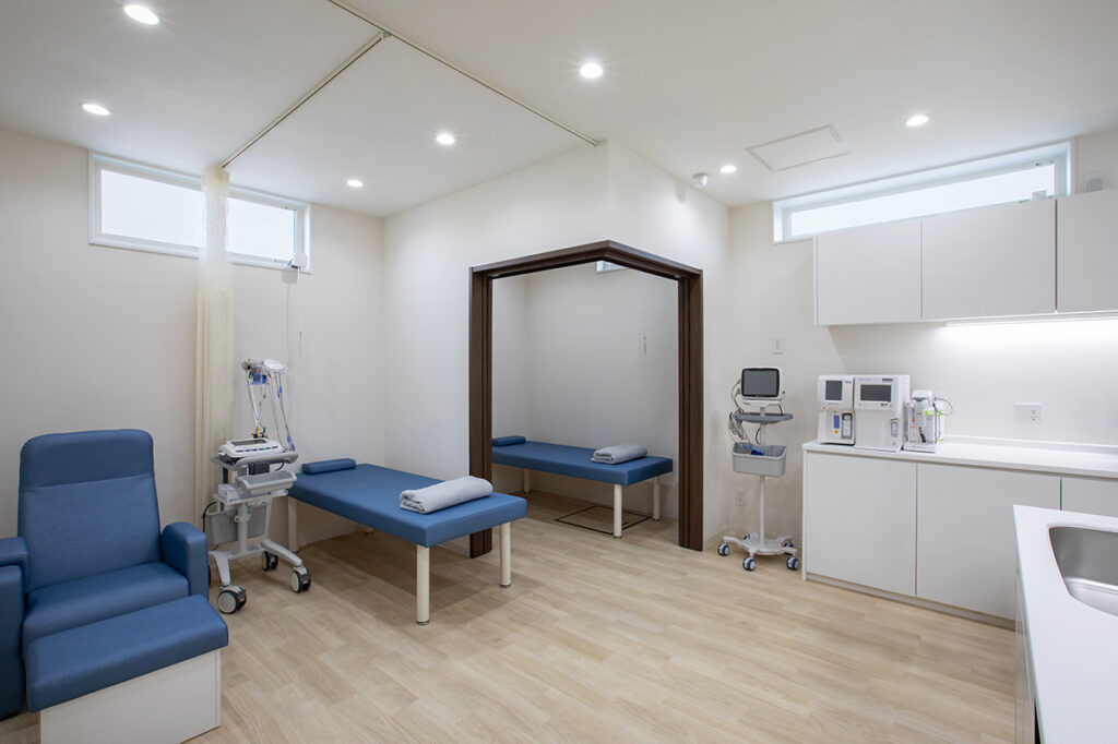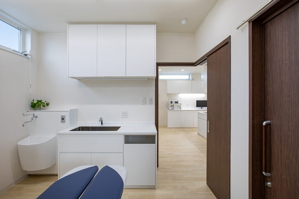 一つは、発熱患者様の対応時にも使用できるようエントランス近くに配置。もう一つは、処置室内に設けました。引き戸で間仕切ることで個室にもなり、検査後のリカバリールームとしても使用するなど、多目的に活用できます。