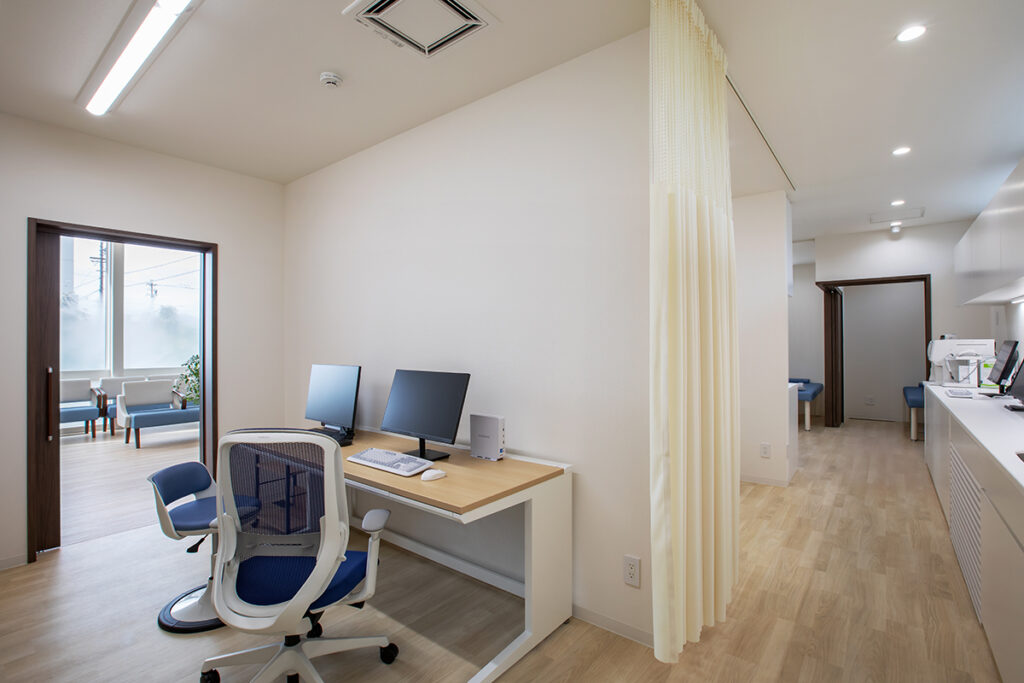 患者様の動線と交わることがないため、患者様のサポートもスムーズ。診察や事務作業などが効率的に行えるよう機能的なバックヤードスペースも設けています。